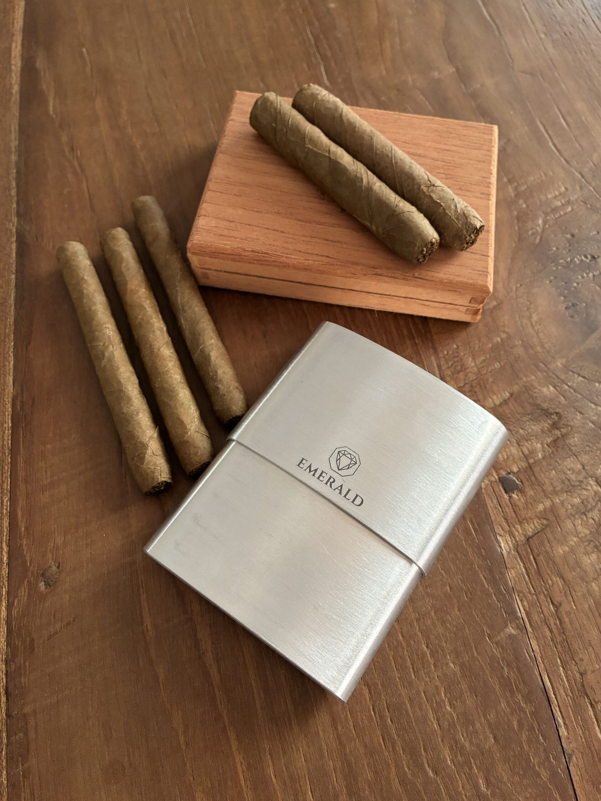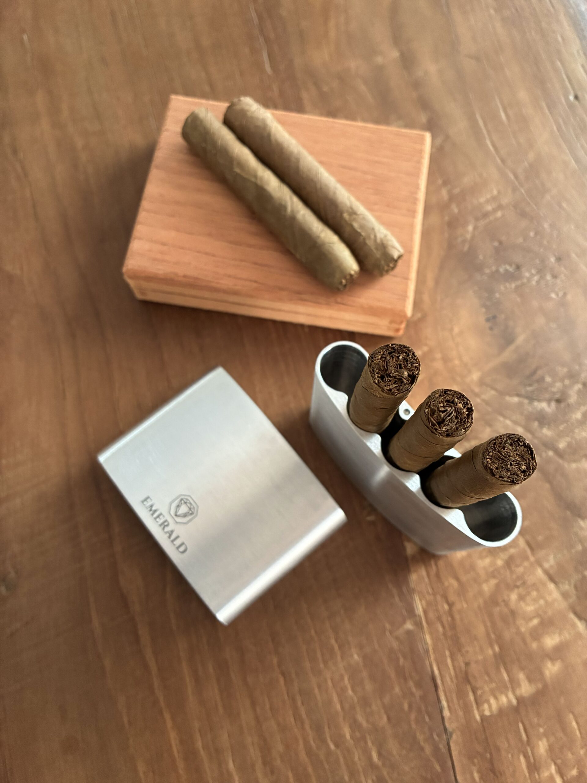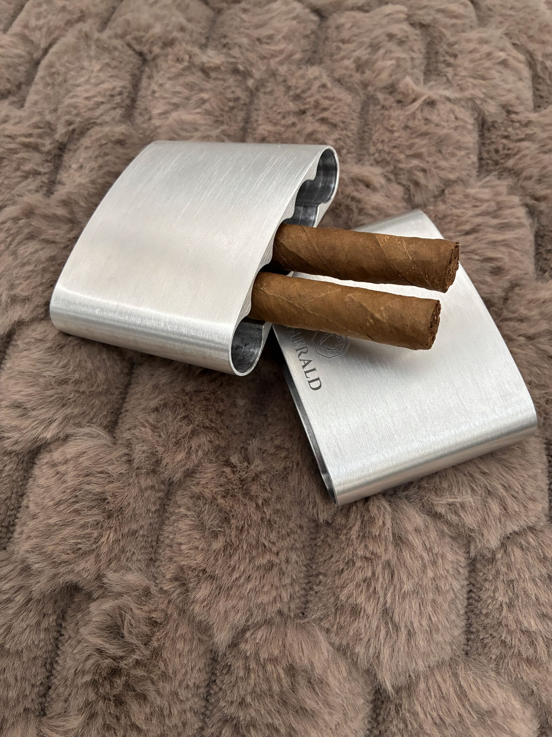 Inspired on the iconic shape of a whiskey hip flask, this tailored cigar case fits comfortably in your pocket, due to its smooth bent shape with rounded corners.